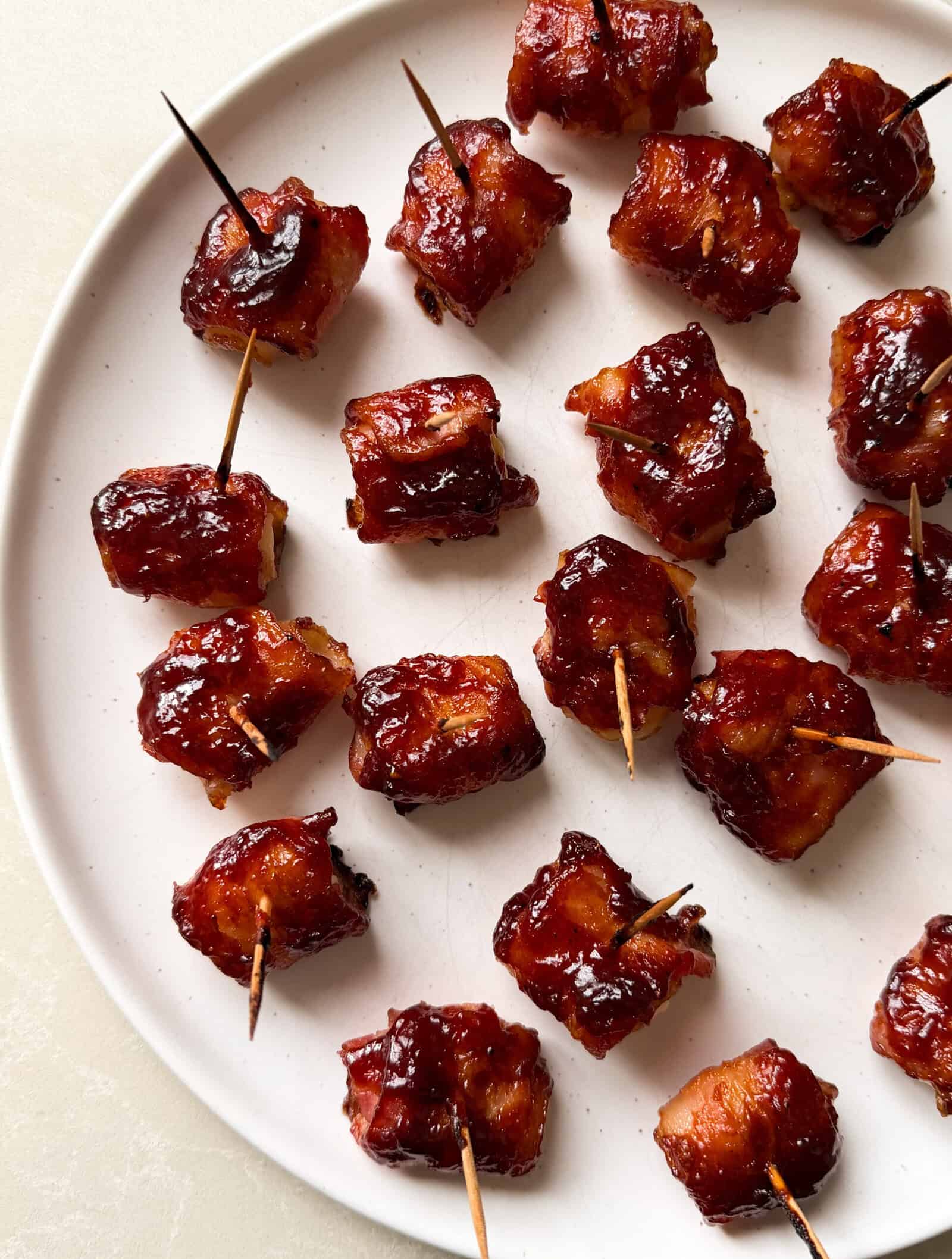 The homemade BBQ sauce is quick to throw together and hits all the right notes: tangy, sweet, smoky, and just a little savoury. It thickens nicely in the oven, clinging to the bacon and creating that glossy, sticky finish that’s impossible not to love. Want more great party appetizers? Try my Spanakopita Dip with Crispy Phyllo Topping, French Onion Potato Skins, and Stuffed Mushrooms with Bacon and Boursin.