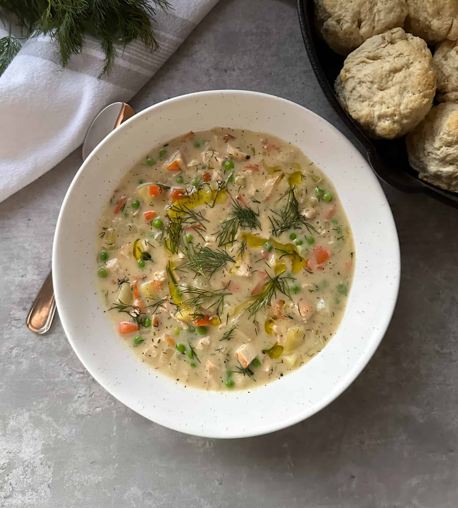 A bowl of creamy chicken pot pie soup with peas, carrots, and fresh dill sits on a gray surface next to a pan of biscuits and a white towel with a spoon partially visible.