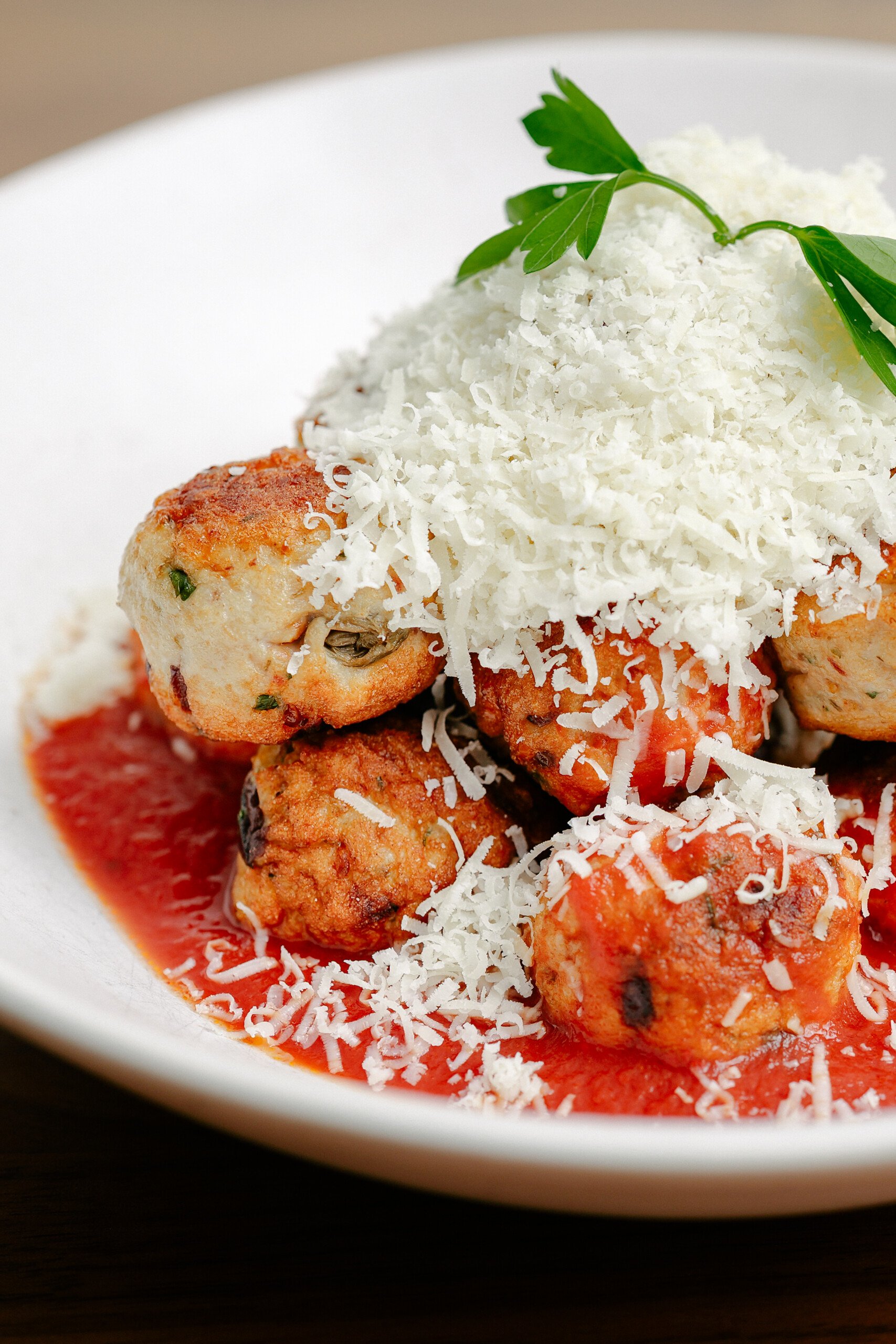 - In a large bowl, combine all ingredients except for the basil, tomato sauce, and canola oil. Mix until well incorporated. Avoid over-mixing as this may result in a tougher meatball.Sammy’s tip: if the mixture feels too tacky (sticky), add a small amount of extra breadcrumbs until it is easy to shape into balls.