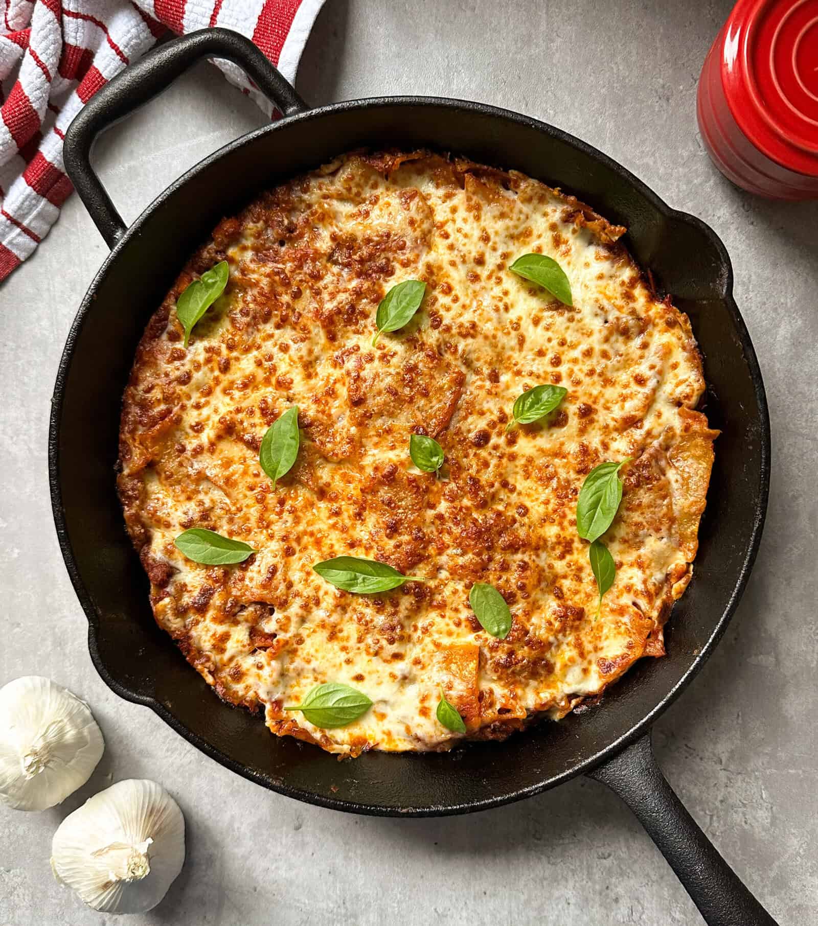 If you happen to have leftover skillet lasagna, store it in an airtight container in the fridge for up to 3 days. Add a splash of water or extra tomato sauce to loosen it up. You can also freeze portions for up to 2 months; just thaw overnight in the fridge before reheating.