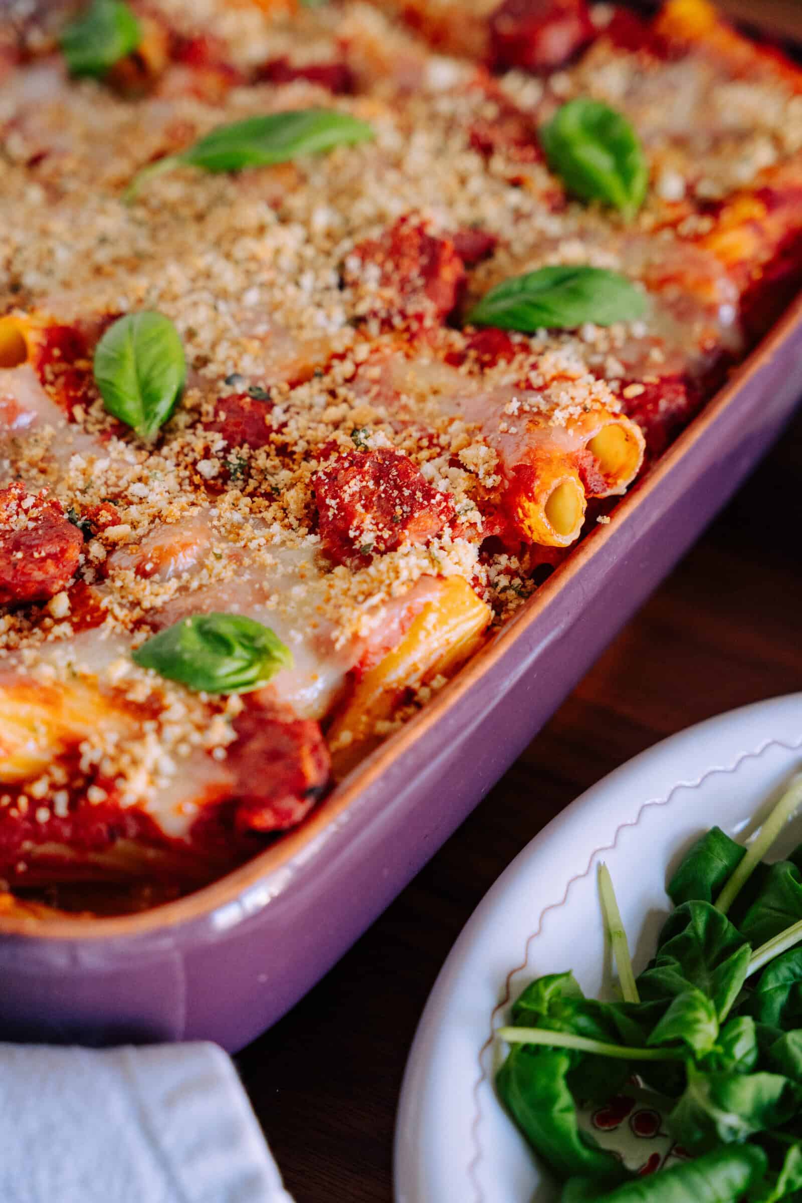 A close-up of a baked pasta dish topped with tomato sauce, melted cheese, breadcrumbs, and fresh basil leaves in a purple baking dish, with a side of fresh green salad on a white plate.