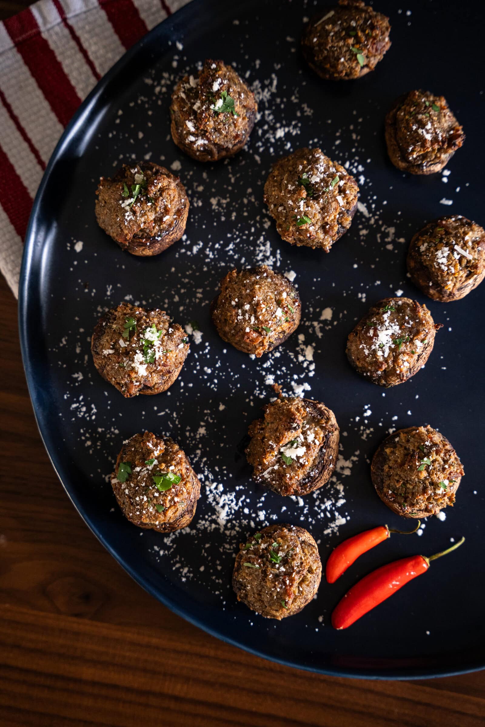 A dark blue plate with several baked stuffed mushrooms sprinkled with herbs and grated cheese, next to two red chili peppers. Perfect for anyone searching for a Stuffed Mushrooms Recipe, a red and white striped cloth is partially visible in the background.